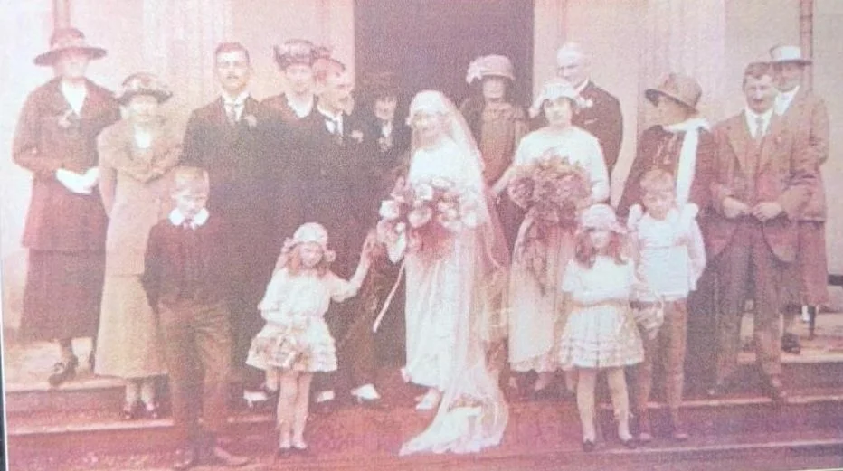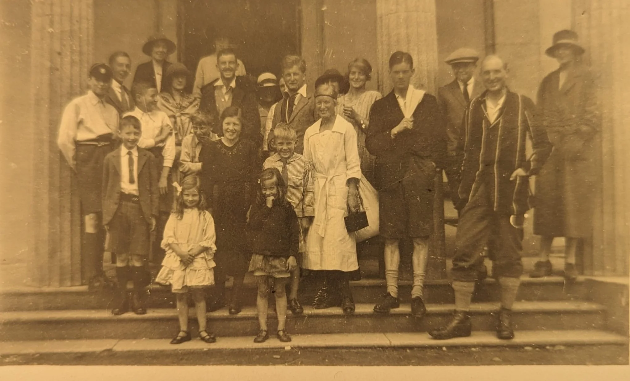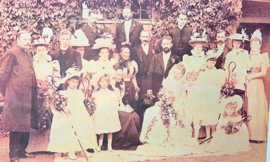 In George Lyndon's arms is Joan Annella Bomford, born at Oakley Park on 17th September 1917. She later married Armine David in 1939 and passed away on 4th August 2019 at the age of 102. To this day, we have Joan’s diary dating from 1917 to 1939, recording her life from the cradle to the wedding ring, capturing moments when she got married and moved out of Oakley. George Lyndon Bomford is pictured alongside his family, including his wife Helen Mary Maud Bomford (nee Corbould-Warren), born on 3rd October 1873. She married George Lyndon Bomford in 1897 at the age of nearly 24. Their son, John Lyndon Bomford, was born at Oakley Park on 23rd October 1912, and he passed away on 26th April 1968 at the age of 55. Also mentioned in the family tree are Mrs. Elinor Bomford (George's mother, nee Bolton) and Dorothy Eileen Bomford, born at Oakley Park on 7th March 1905. Dorothy died on 17th September 1967 at the age of 62 and married John Marten Rush Cripps at Kells on 1st February 1934.